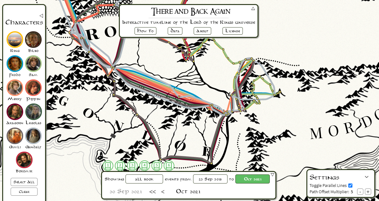 As part of the course DH2321 Information Visualization at KTH, I was part of a team with four other people, and we created this visualization. It shows the paths that the major characters of the Lord of the Rings trilogy take through the story, on a large interactive map.